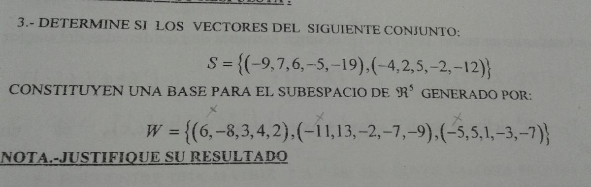 Luego, observa que si puedes expresar a cada uno de los vectores del conjunto W como combinación lineal de los vectores del conjunto S, entonces tienes que S es una base del subespacio vectorial generado por el conjunto W.