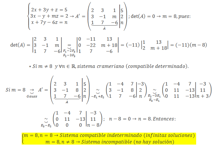 1) Si D ≠ 0, que corresponde a m ≠ 8, tenemos que el sistema es compatible determinado con única solución, que no es lo que nos piden en el enunciado.