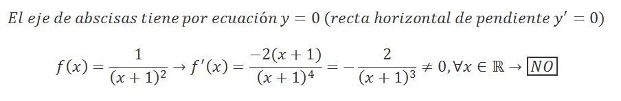 f ' (x) = -2/(x+1)3, luego, planteamos la condición necesaria para una recta tangente paralela al eje de abscisas: