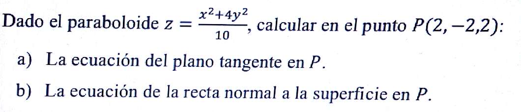 a) La ecuación del plano tangente al paraboloide en el punto P queda: