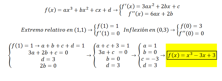 1. Hallar una función polinómica de tercer grado que tenga un extremo relativo en (1 , 1) y un punto de inflexión en (0 , 3).