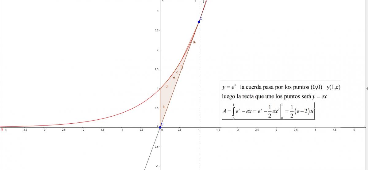 A = ∫ ( (e-1)x + 1 - ex ) dx = [ (e-1)x2/2 + x - ex ], evaluamos con la regla de Barrow entre 0 y 1 y queda: