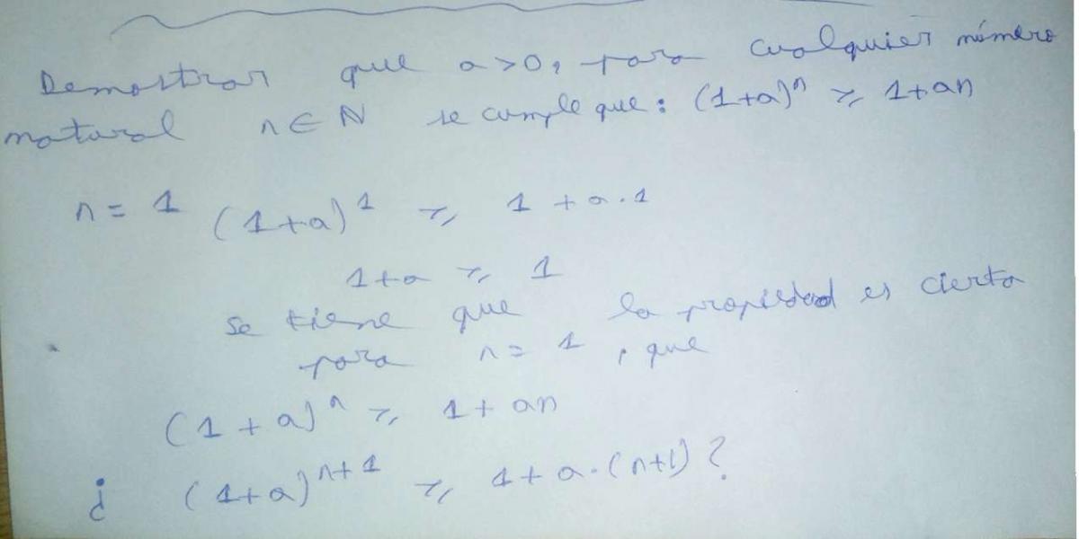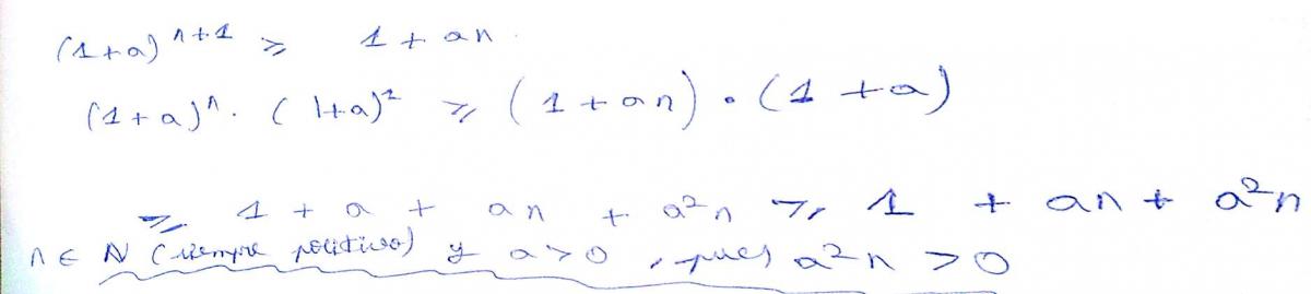 (1 + a)n+1 = (1 + a)n(1 + a) ≥ aplicamos la hipótesis inductiva ≥ (1 + na)(1 + a) = distribuimos: