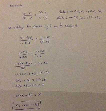 1. Tienes dos puntos, por lo que podrás sacar la recta que pasa por ambos puntos. (X - X1)/(X2-X1) = (Y - Y1)/(Y2 - Y1) (Ojo con la prioridad de los signos y operaciones).