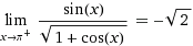Lím(x→π+) senx/√(1 + cosx) = Lím(x→π+) ( senx√(1 - cosx) / (-senx) ) = simplificamos = Lím(x→π+) √(1 - cosx) / (-1) = √(2) / (-1) = - √(2).