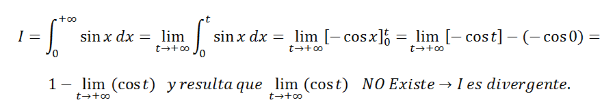 Lím(t→+∞) cost, que no existe, ya que la función f(t) = cost está acotada entre -1 y 1, y oscila indefinidamente entre esos dos valores, sin acercarse a ningún valor específico que pertenezca al intervalo [-1,1]. Este es el caso de un límite que no existe por ser "oscilante".