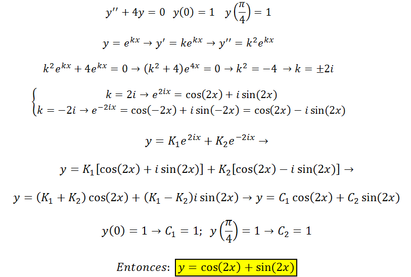 Recuerda que en este tipo de ecuaciones, cuando la ecuación característica tiene soluciones complejas conjugadas, del tipo r = a ± bi, tenemos que la solución general queda: