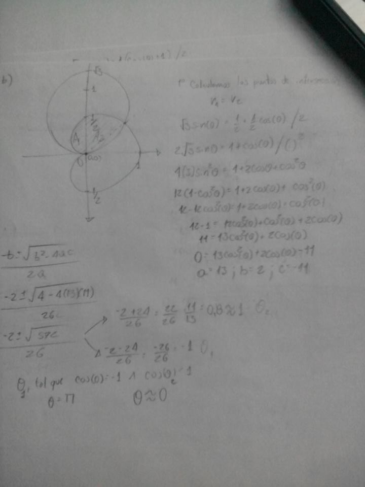 De lo cual ya hice a donde me da una cardioide: 1/2 + 1/2 cos(theta) pero la interseccion solo se cumple en pi pero el otro punto de interseccion no puedo obtenerlo