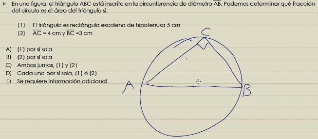 Según las claves sale la B), pero según yo con la (1) sería suficiente para determinar qué fracción del circulo es el area del triangulo, ya que si dice que la hipotenusa es 5, podemos decir que el radio es 2,5, y con eso también determinar la altura del triangulo y sacar area