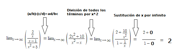 hay un problema y no me deja subir imagenes. El limite es de x que tiende a mas infinito, hay dos fracciones por un lado 2/x y por otro (x-1)/(x^2 + 5) y las dos fracciones se dividen. Me he dado cuenta de que no eleve al cuadrado el denominador de la segunda fraccion en el primer enunciado ;).