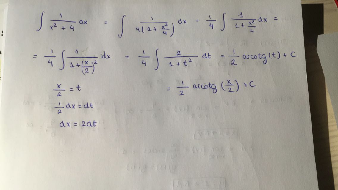 I = ∫ (1 / (4 + x2) ) dx = ∫ ( 1 / (4sec2w) )*2 sec2w dw = ∫ ( 1 / 4sec2w )*2 sec2w dw = 2/4 ∫ dw = (1/2) w + C = sustituimos = (1/2) arctan(x/2) + C.
