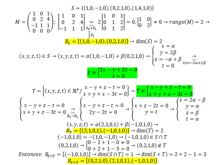 En R4 se considera el subespacio S generado por (1 0 − 1 0), (0 2 1 0) y (1 4 1 0) y el subespacio T ={(x,y,z,t) | x−y+z−t=x+y+z−3t=0}. Hallar bases de S, T, S+T, S∩T y busca un U que verifique S+U =T +U =R4.