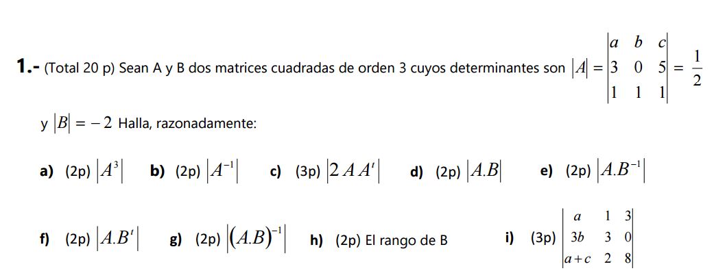 Digamos que el determinante de la inversa de A·B es el inverso del determinante de A·B sabiendo que por la propiedad de los determinante el determinante de un producto es igual a la multiplicación de sus valores.