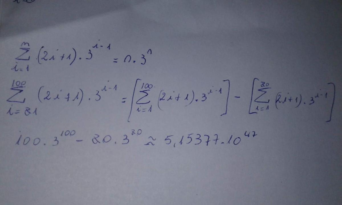 ∑(i=81,100) (2i+1)*3,i-1 = ∑(i=1,100) (2i+1)*3i-1 - ∑(i=1,80) (2i+1)*3i-1