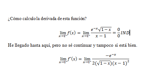 Buenas, a ver si podéis ayudarme con la derivada de esta función. He desarrollado hasta cierto punto pero no sé si está bien ni como continuar: