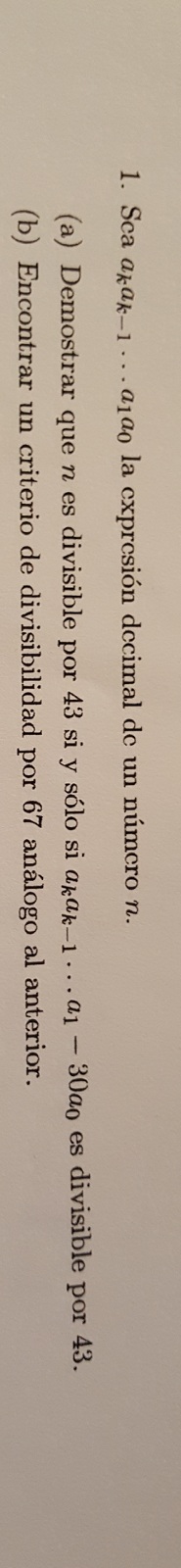 Luego, tienes que modificar el enunciado, y si en lugar de 30a0 escribes 20a0, y si en lugar de 43 escribes 67, tendrás tu regla de divisibilidad para 67, que puedes intentar demostrar como ejercicio.