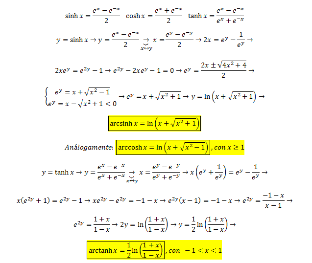 w = x ± √(x2 + 1), luego vuelves a sustituir (observa que elegimos el signo positivo para la raíz, porque las exponenciales toman valores estrictamente positivos) y queda: