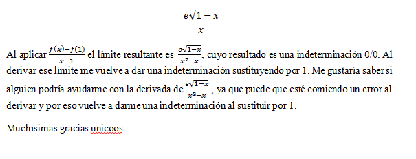 f+' (1) = Lím(x→1+) ( e √( x - 1 ) ) / (x - 1) = e Lím(x→1+) ( ( x - 1 )1/2 ) / (x - 1)1 = e Lím(x→1+) ( ( x - 1 )-1/2 ) = e Lím(x→1+) ( 1/( x - 1 )1/2 ) = + infinito;