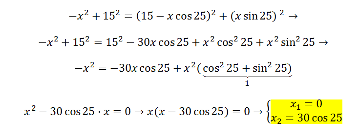 -x2 + 152  = (15- xcos25)2 + (xsen25)2