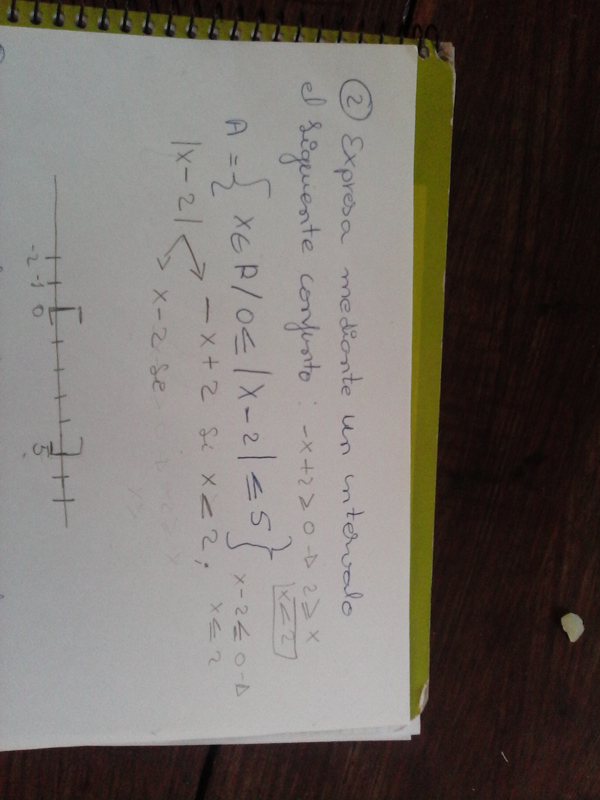 0 ≤ |x - 2| ≤ 5, luego tienes que deben cumplirse dos inecuaciones a la vez: