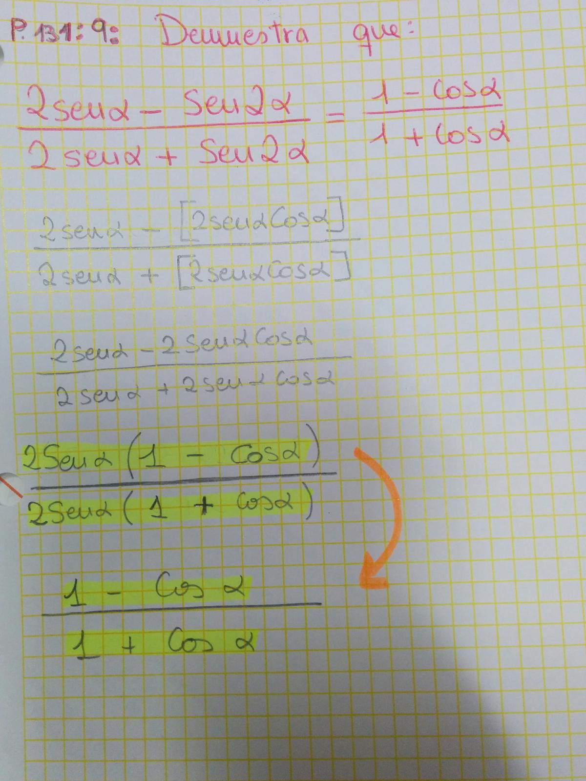 Observa que una vez que simplificas los factores 2senα del numerador y del denominador como indica el colega César, te queda: