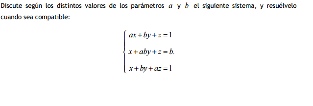 No soy capaz de discutir este sistema en función al valor de a y b (me está costando obtener el determinante de A y A*)