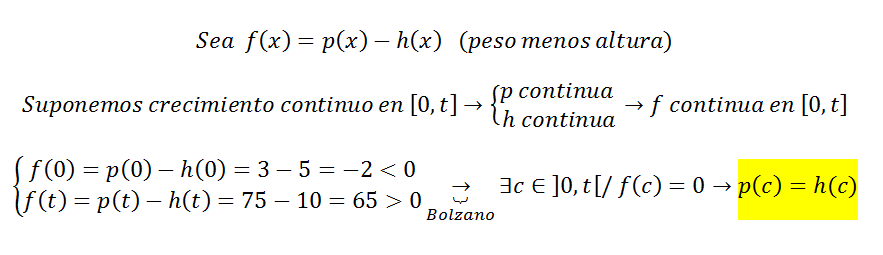 Un niño al nacer pesa 3 kg y mide 5 dm. Como adulto (transcurridos t años) su estatura es de 10 dm y su peso de 75 kg. Suponiendo continuas la estatura y el peso en función del tiempo, demostrar que hay algún momento de su vida en el que su peso en kg y su altura en dm son iguales.