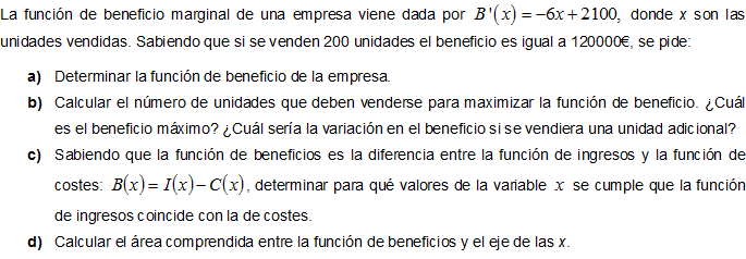 Si te dan B'(x), para hllar B(x) tendrás que integrar... La integral de -6x+2100 es B(x)=-3x²+2100x+C...Como sabemos que al vender 200 unidades (x=200) el beneficio es 120.000€ ... -3.200² +2100.200 +C=120000, de donde podrás obtener C...