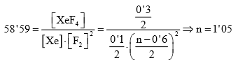 Hola, alguien podría ayudarme a despejar la n? Ignorad la formula [XeF4] y todo eso, es simplemente igualar 58.59 a la ecuación... Intento hacerla una y otra vez y no me da n ese resultado...