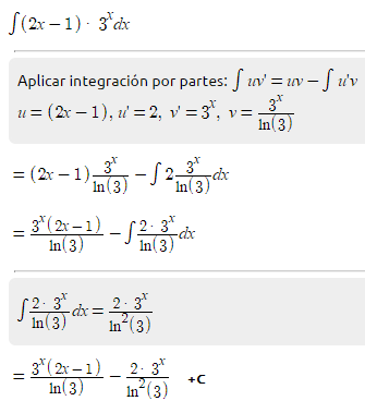 I = uv - ∫ vdu = (2x - 1)*3x/ln3 - ∫ (3x/ln3) dx = (2x - 1)*3x/ln3 - (1/ln3) ∫ 3x dx, resolvemos la integral secundaria y queda: