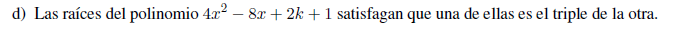 Luego, las raíces del polinomio son: x1 = 1/2, x2 = 3/2, y su expresión es: P(x) = 4x2 - 8k + 3.