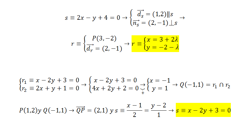 por lo que tenemos que la recta s pasa por el punto de corte: Q(-1,2).