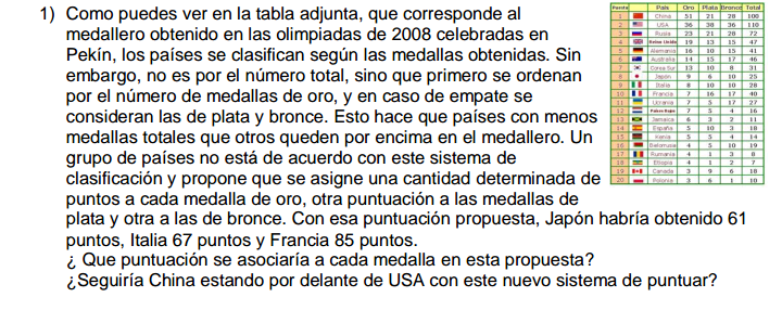 Luego, tienes que sustituir las medallas que tiene cada país multiplicadas por la incógnita e igualarlas al resultado de puntos, es decir: