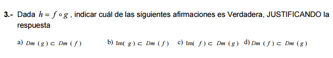Hola! Quería saber si alguien podría ayudarme con este enunciado de dominio de funciones compuestas. Generalmente, los ejercicios prácticos me salen bien, pero cuando debo responder conceptos teóricos me cuesta explicarlos. Muchas gracias