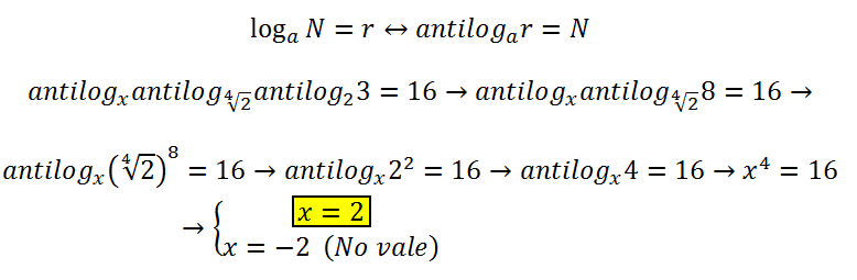 luego concluimos con: antilogx4 = x4 = 16, luego expresamos a 16 como potencia con base 2: