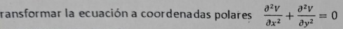 En el segundo Ejercicio me pide transformar la ecuacion a coordenadas polares hasta donde llegue fue armando la funcion V y luego fui derivando porque la Funcion ; V=(x,y) , pero lo que no se es como lo transformo a coordenadas polares....
