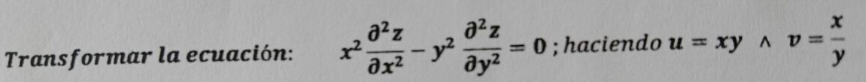 Muy buenas tardes o noches o buen dia jeje. me plantearon este ejercicio como tarea pero no logro resolverlo porque me pide transformar la ecuacion pero nose que deberia hacer en este caso porque tengo la ecuacion y esta igualada a 0 si despejo x o y llegare a lo mismo se que debo plantearme una funcion Z y otra funcion z pero nose como aplicar la u y v que me dan en el ejercicio ...