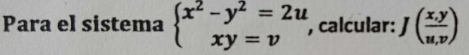 buenas tengo estos 2 ejercicios de los cuales estan son mis dudas en el primero donde me pide para el sistema me pide hallar el Jacobi de (x,y/u,v) se como armar el Jacobi pero lo que no puedo es como resolver el ejercicio de antemano agradezco a quien me ayude en esto