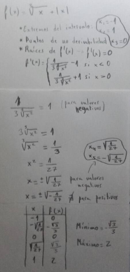 La función es continua por doquier (aunque no sea derivable en x = 0). El teorema de Weierstrass asegura la existencia de extremos absolutos en cualquier intervalo cerrado. Y el Teorema de Fermat te va a decir que los busques en los extremos del intervalo y en los puntos críticos (de derivada 0 o sin derivada).