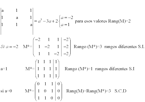 Luego, concluimos que el sistema es compatible indeterminado, y sus soluciones quedan expresadas: x ∈ R, y ∈ R, z = - x - y + 1.