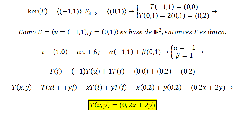 b) Hallar la formula de la transformacion lineal T: R2--> R2 si Nu(F)= gen{(-1;1)} y λ=2 es un autovalor asociado a T y al autovector v(0;1). Es unica?