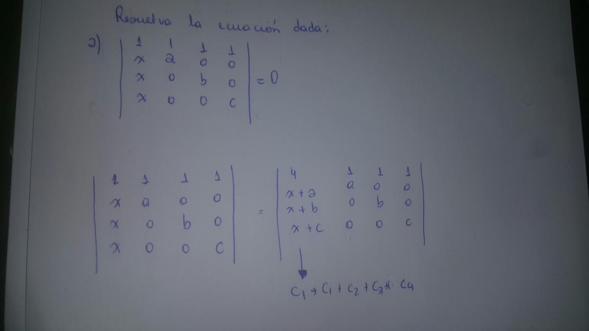 Hola!! Queria saber si me podrian dar una mano con este ejercicio, utilizando Propiedades de los Determinantes. Cómo seguir a partir de allí o alguna otra forma de resolver la ecuación. Muchas gracias!!![]()