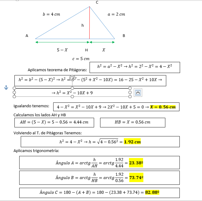 º Calcula los ángulos de un triángulo cuyos lados miden a=2cm; b=4cm; c=5cm. Se que el semiperímetro del triángulo es p = (a+b+c)/2., por lo tanto seria :