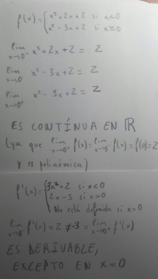 Luego, has señalado correctamente que la función es continua en R, y también que es derivable en R - {0}.