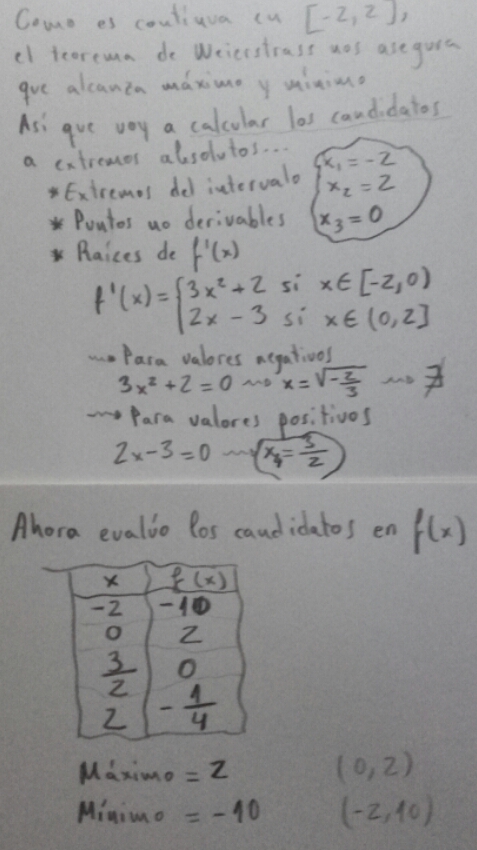 Por lo tanto, concluimos que la función alcanza su valor míniimo absoluto en x = -2, y su valor mínimo absoluto en x = 0.