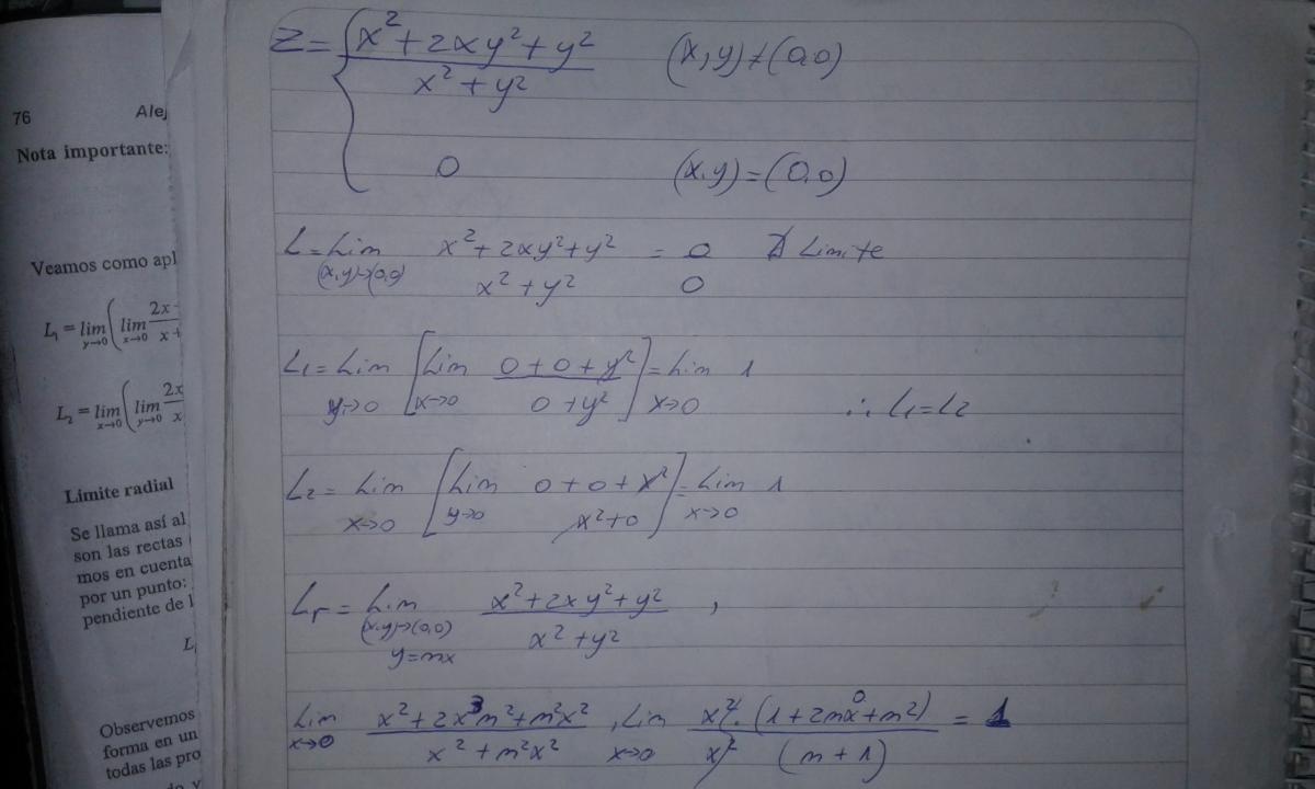 Luego, puedes continuar la tarea del cálculo del límite para (x,y) tendiendo a (0,0), y observa que el primer término es constante, y que el segundo tiene límite igual a cero, y podrás demostrarlo con el teorema de acotación (o de encaje, o "del sandwich"), como seguramente has hecho en clase en otros ejercicios.