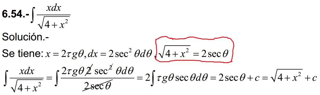 I = 2 ∫ dy = y + C = 2secθ + C = .sustituimos a partir de la ecuación señalada (*) = 2(1/2)√(4 + x2) + C = √(4 + x2) + C.