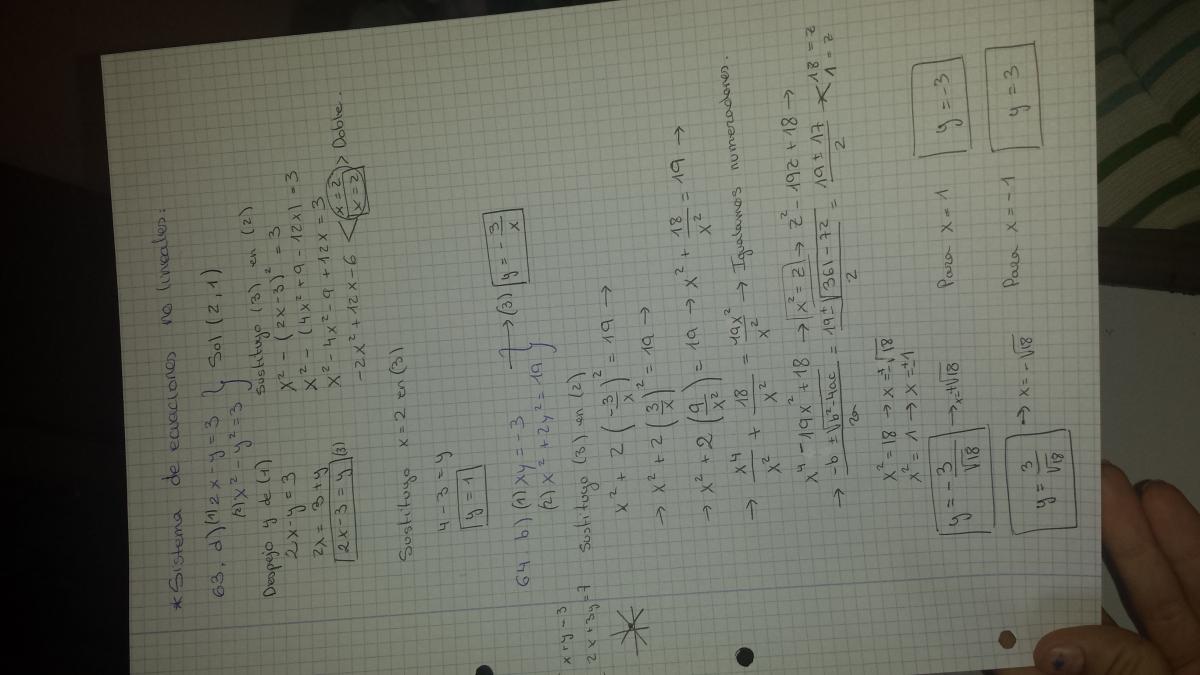 En el ejercicio 63, observa que has consignado erróneamente la ecuación polinómica cuadrática, pues has llegado correctamente a la ecuación cuadrática: x2 - 4x2 - 9 + 12x = 3, pero cuando haces pasaje de término, reduces términos semejantes y ordenas queda: -3x2 + 12x - 12 = 0, luego divides por -3 en todos los términos de la ecuación y queda: x2 - 4x + 4 = 0, cuya solución es x = 2 como has consignado. Luego, la solución es x = 2, y = 1, como has consignado correctamente.