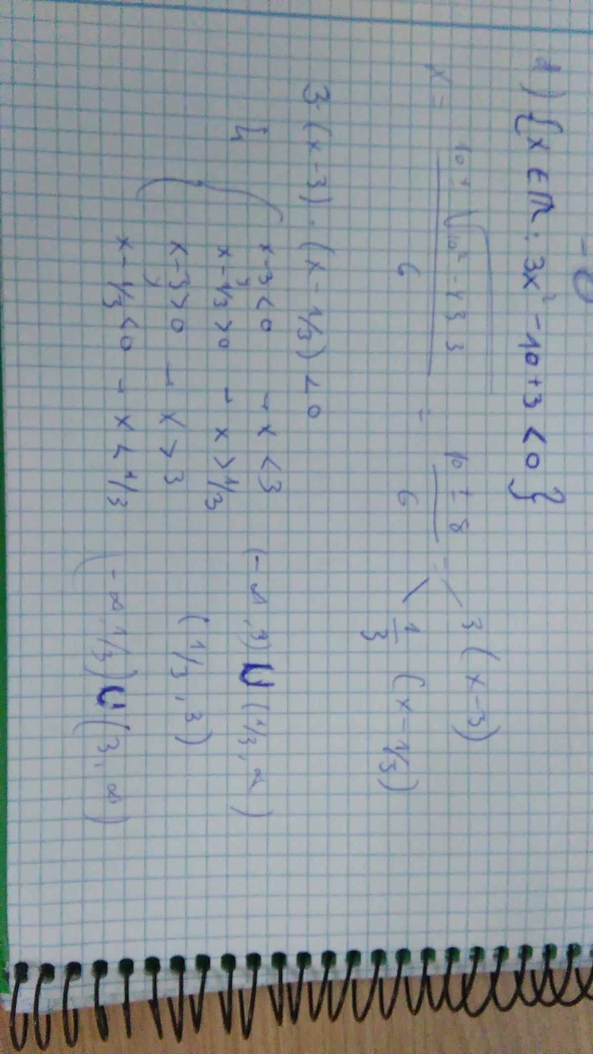 b) x - 3 < 0 y x - 1/3 > 0, que equivalen a: x < 3 y x > 1/3, que nos conduce al intervalo: (1/3,3);