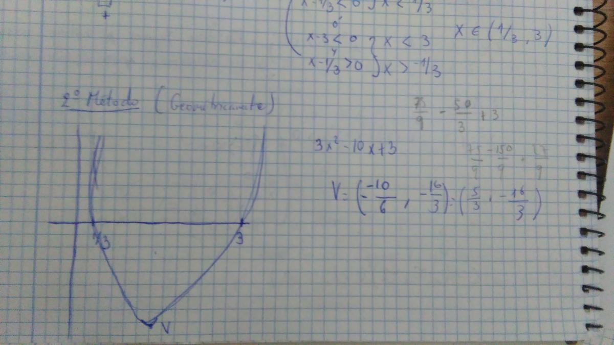 f(x) = 3x2 - 10x + 3, observa que su gráfica es una paraábola con vértice mínimo y, para visualizar mejor, buscamos la forma canónica, y para ello planteamos las coordenadas del vértice: